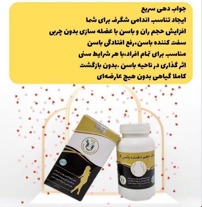 شیاف حجم دهنده باسن لارا محصولی از شرکت مرهم شفا لارا میباشد که جزو بهترین شیافهای حجم دهنده در ایران است. شیاف حجم دهنده لارا ، با افزایش و تنظیم هورمونهای مخصوص ماهیچه سازی اندام لگن، موجب افزایش میزان حجم لگن از طریق پروتئین سازی میشود.